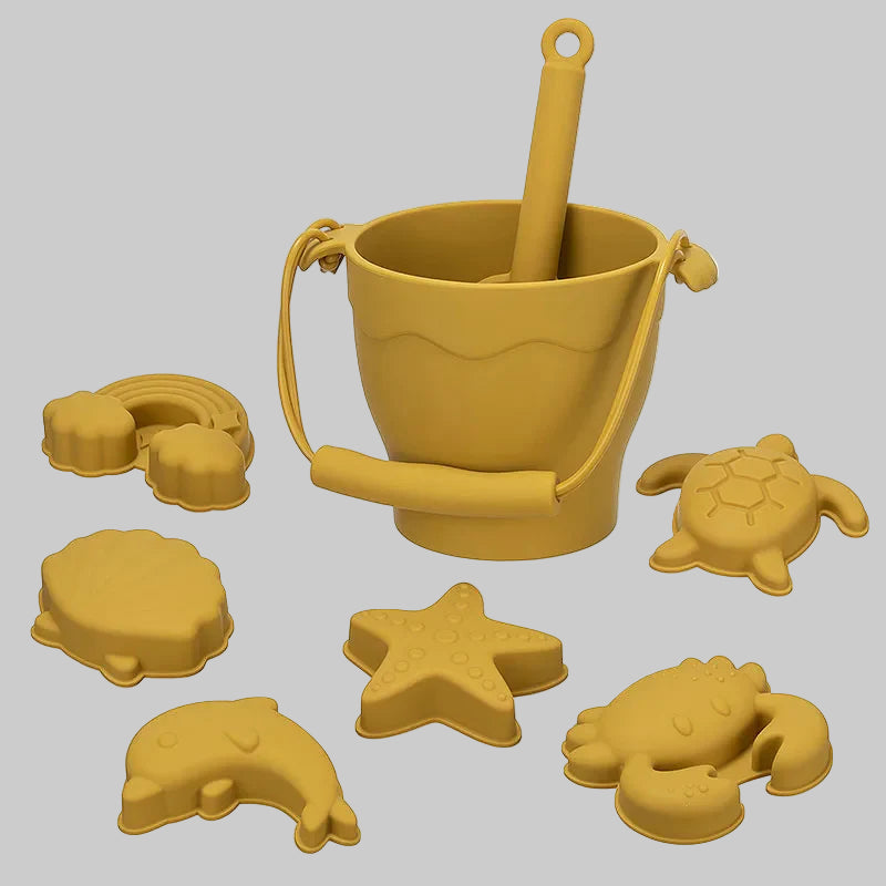 HOURS OF FUN..... creating sand castles and sand animals with this beautiful food grade silicone set! Safe and resistant, it includes a practical bucket, a shovel and six soft molds.